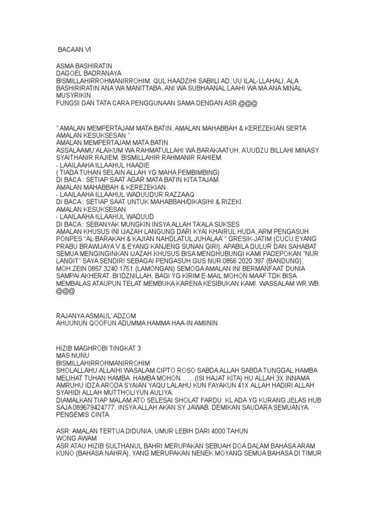 Selanjutnya sampaikan ucapan terima kasih dan salam penutup. Diatas adalah bacaan asma nakaban, untuk bisa mengunakanya, anda di haruskan menjalani puasa seperti biasa selama 41 hari dan membaca asma tersebut selepas sholat fardu sebanyak 7 kali. Lakukan sholat taubat dan hajat. Panggilan pun mulai berdatangan, bahkan kadang seharian full tamunya antrian dirumahnya, sampai kewalahan saya mas", katanya. Salam hormat tuk para sesepuh kwa dan salam perseduluran untuk para dulur2 kwa semuanya.